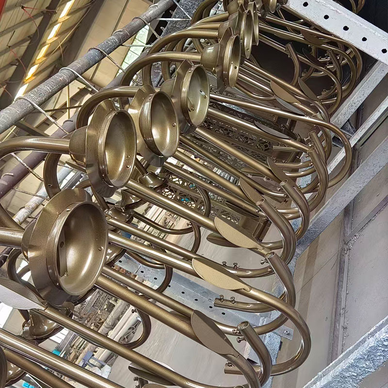 灯杆成型后,内外热镀锌防腐处理,镀锌工艺经过酸洗、镀锌、水洗、磷化、钝化等工艺过程,表面光洁,无色差,且镀层均匀性好,具有很强的防腐性能要求。